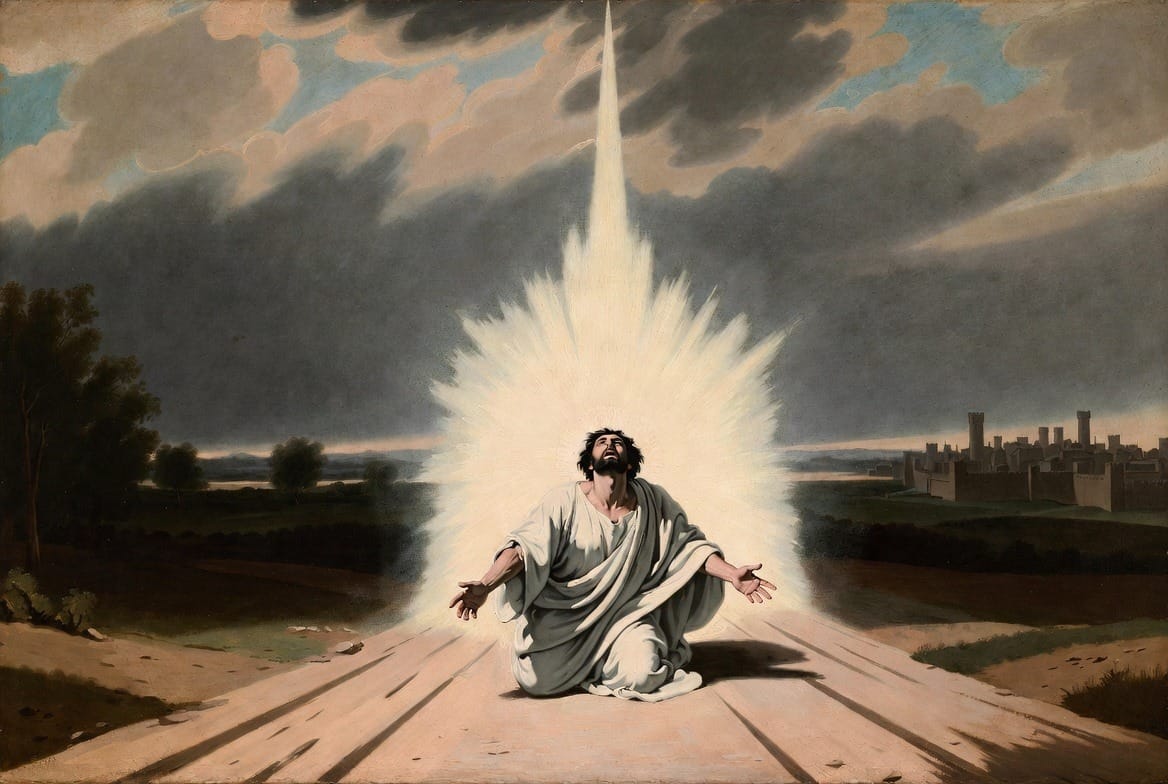 The turning point came suddenly. Journeying to Damascus, "suddenly there shined round about him a light from heaven" (Acts 9:3, KJV). Falling to the earth, he heard: "Saul, Saul, why persecutest thou me?" (Acts 9:4, KJV). Identifying Himself as "Jesus whom thou persecutest" (Acts 9:5, KJV), Christ added, "It is hard for thee to kick against the pricks" (Acts 9:5, KJV)—an ancient proverb meaning resistance to divine prompting brings self-inflicted pain.